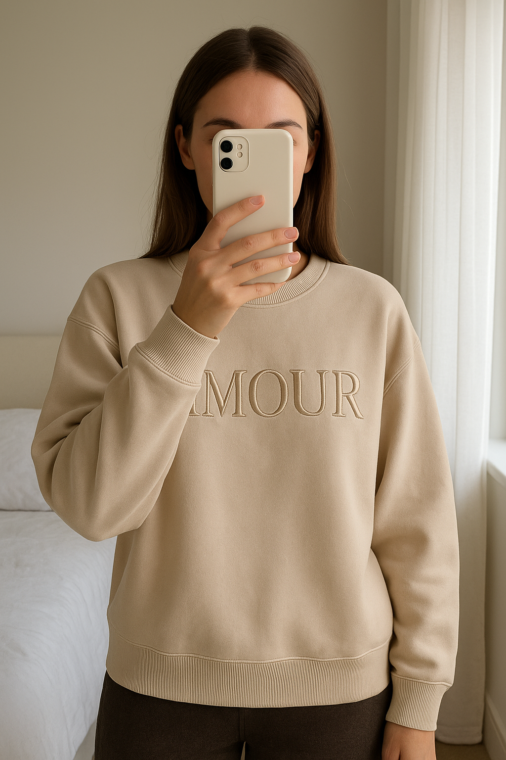 Sweat Mulher em pé, de frente para a câmera, em um quarto com iluminação suave e luz natural filtrando pela janela.
