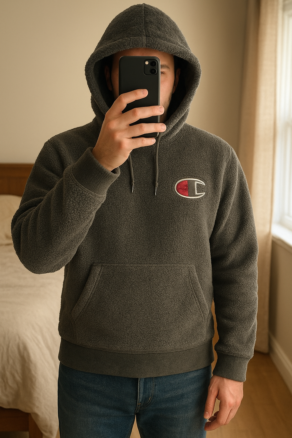 Sweat polaire Champion – Oversize – Taille L debout, face à la caméra, dans une chambre à la lumière douce, avec une lumière naturelle filtrant par la fenêtre.