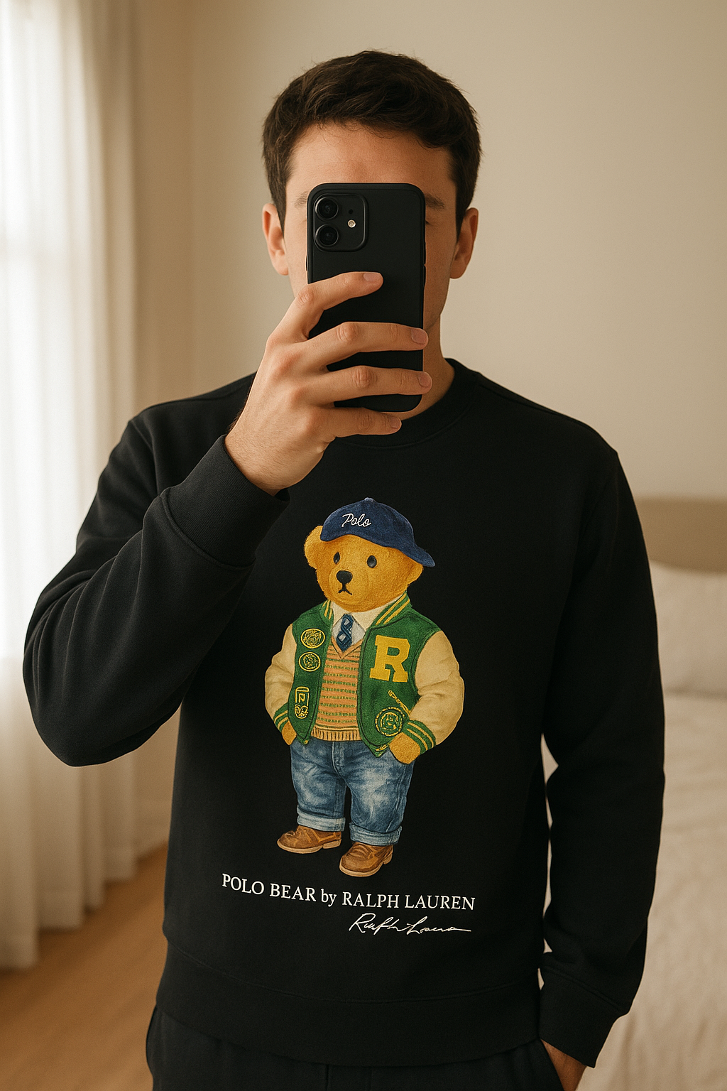 Sweat Ralph lauren debout, face à la caméra, dans une chambre à la lumière douce, avec une lumière naturelle filtrant par la fenêtre.