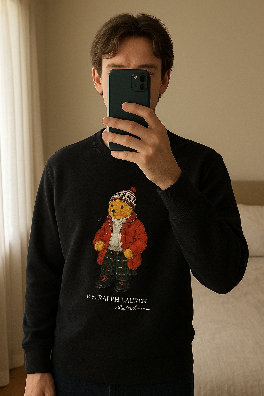 Sweat Ralph Lauren debout, face à la caméra, dans une chambre à la lumière douce, avec une lumière naturelle filtrant par la fenêtre.