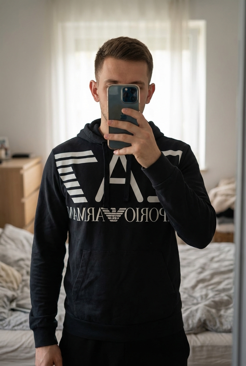 Sweat-shirt emporio Armani debout, face à la caméra, dans une chambre à la lumière douce, avec une lumière naturelle filtrant par la fenêtre.