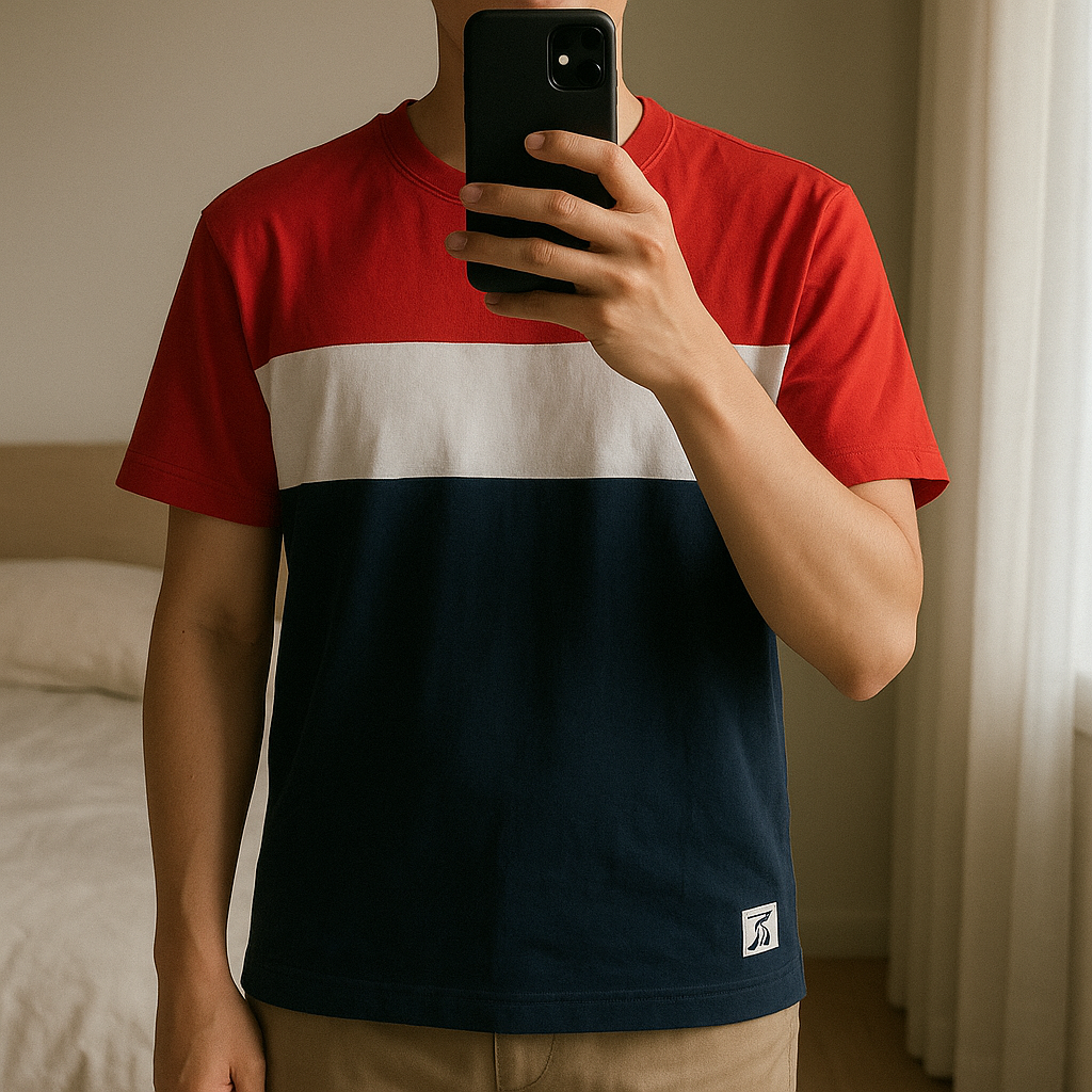 t-shirt debout, face à la caméra, dans une chambre à la lumière douce, avec une lumière naturelle filtrant par la fenêtre.