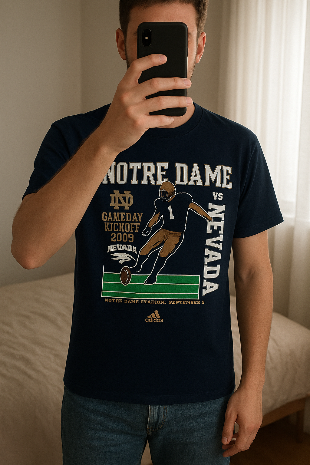 T-Shirt Adidas Notre Dame Football – Edizione Commemorativa 2009 TagliaL in piedi, rivolto verso la fotocamera, in una camera da letto con luce soffusa e luce naturale che filtra dalla finestra.