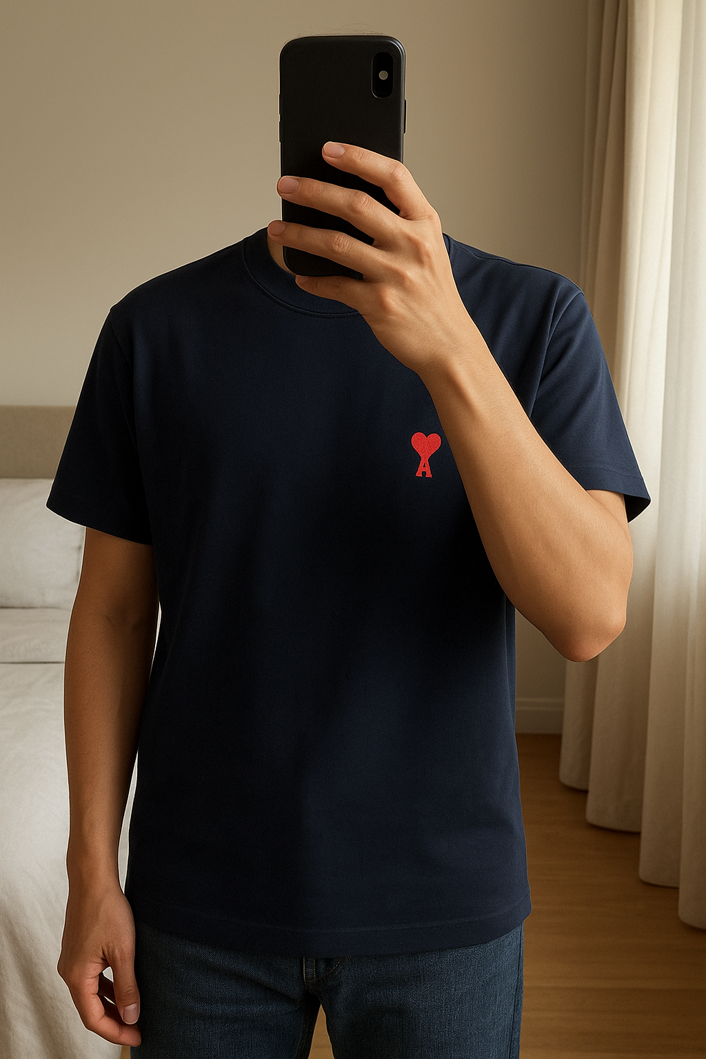 T-shirt bleu marine Ami-Parid debout, face à la caméra, dans une chambre à la lumière douce, avec une lumière naturelle filtrant par la fenêtre.