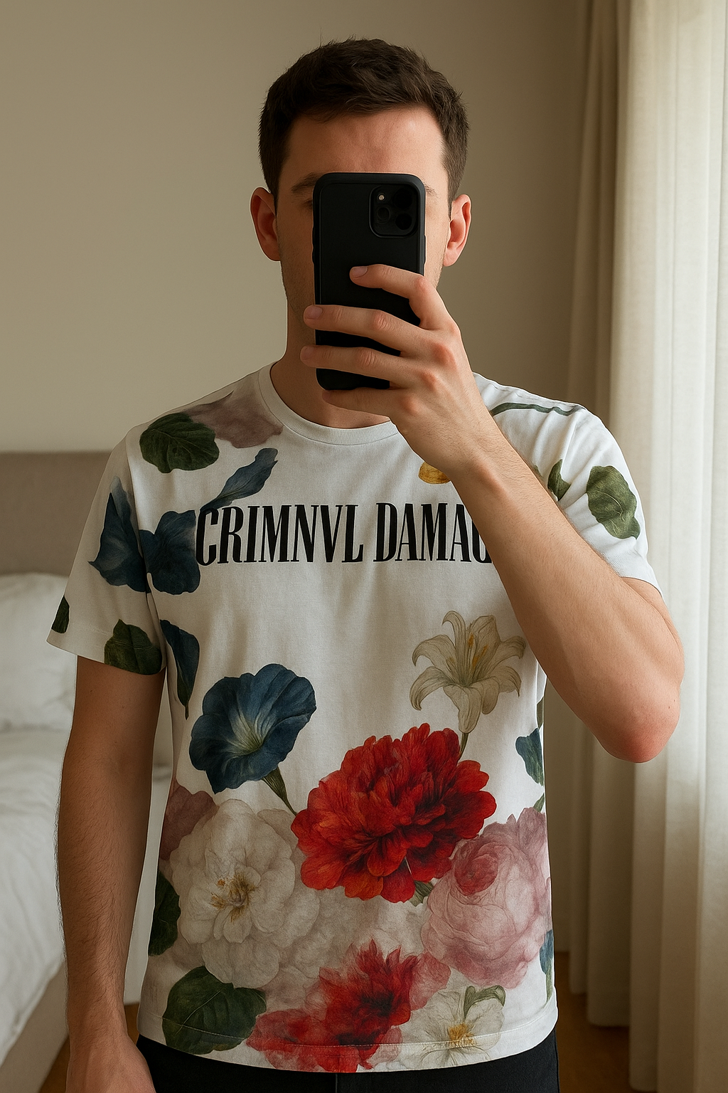 T shirt criminal damage debout, face à la caméra, dans une chambre à la lumière douce, avec une lumière naturelle filtrant par la fenêtre.