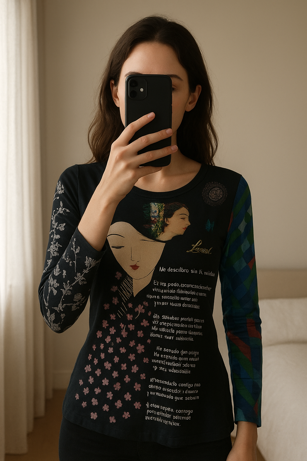 Une personne en T-shirt Desigual cambrant légèrement le dos pour une pose dynamique, avec une silhouette fine, dans une chambre à la lumière douce, avec une lumière naturelle filtrant par la fenêtre.