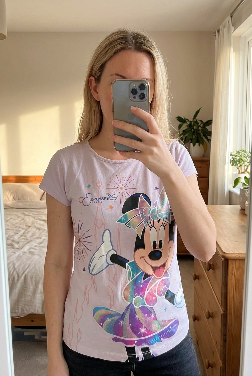 🎆 T-shirt Disney Minnie – Disneyland Paris 30 ans – Taille 12 ans debout, face à la caméra, dans une chambre à la lumière douce, avec une lumière naturelle filtrant par la fenêtre.