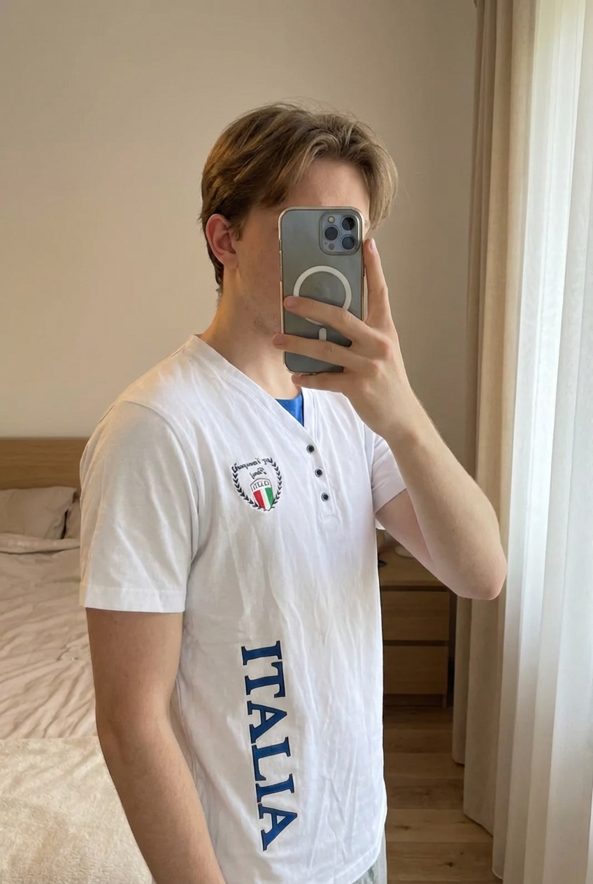 T shirt Italia debout, face à la caméra, dans une chambre à la lumière douce, avec une lumière naturelle filtrant par la fenêtre.