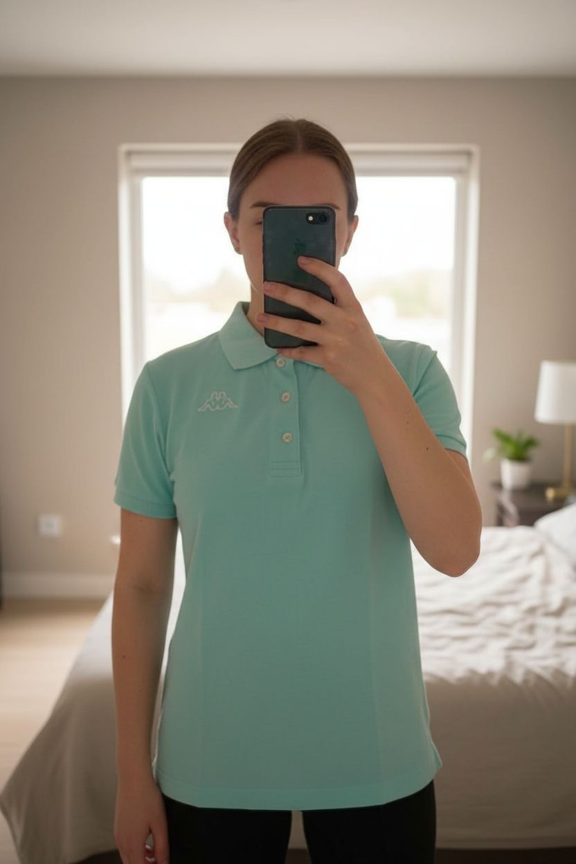 T shirt Kappa Taglia S in piedi, rivolto verso la fotocamera, in una camera da letto con luce soffusa e luce naturale che filtra dalla finestra.