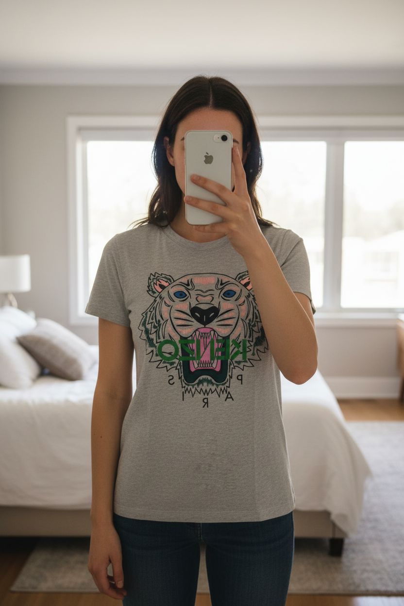 T-shirt Kenzo gris clair debout, face à la caméra, dans une chambre à la lumière douce, avec une lumière naturelle filtrant par la fenêtre.