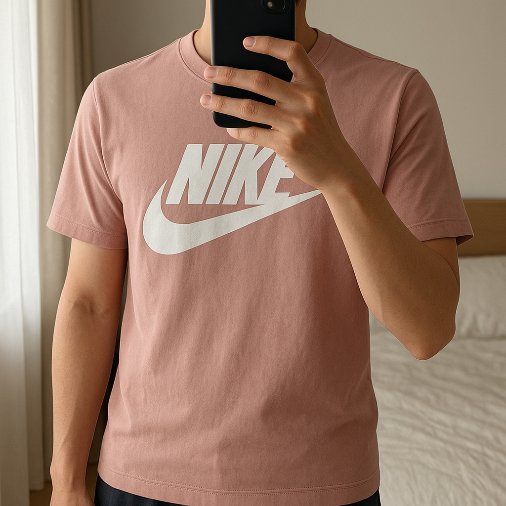 T-shirt Nike debout, face à la caméra, dans une chambre à la lumière douce, avec une lumière naturelle filtrant par la fenêtre.