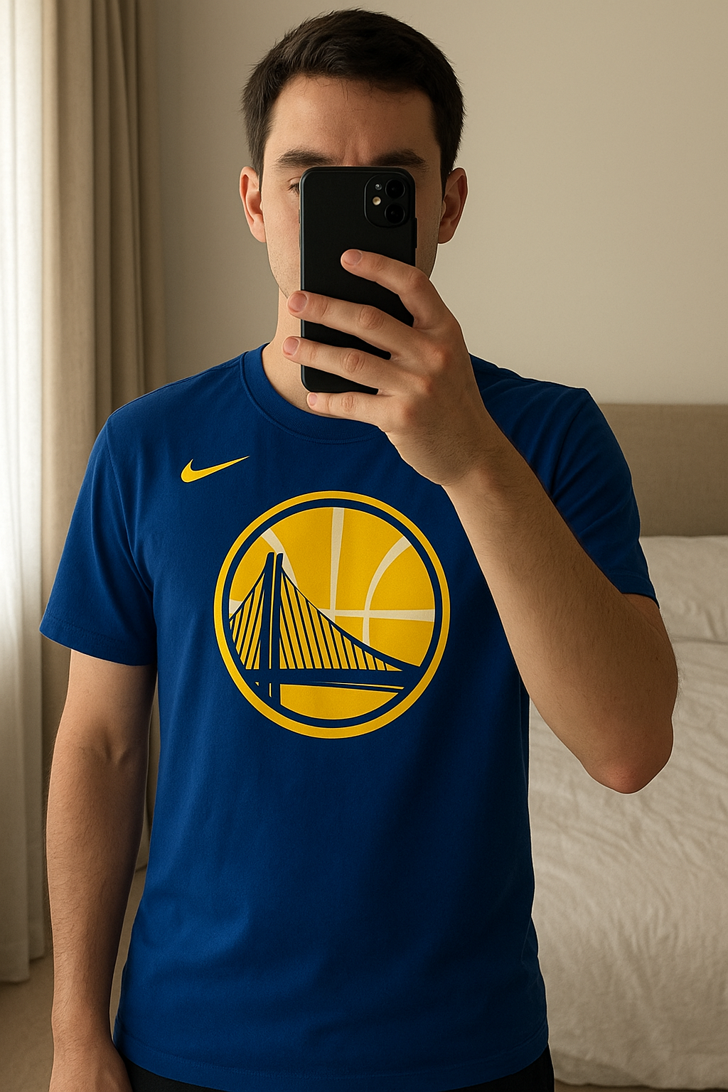 T-Shirt Nike - Golden State debout, face à la caméra, dans une chambre à la lumière douce, avec une lumière naturelle filtrant par la fenêtre.
