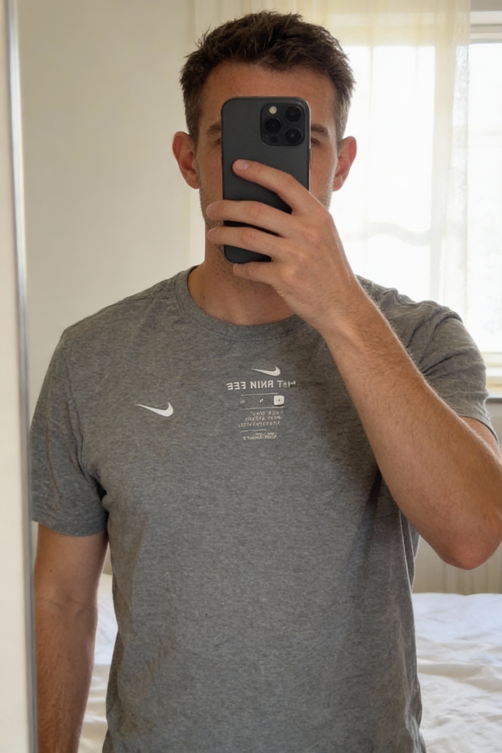 T-shirt Nike Uni Gris debout, face à la caméra, dans une chambre à la lumière douce, avec une lumière naturelle filtrant par la fenêtre.