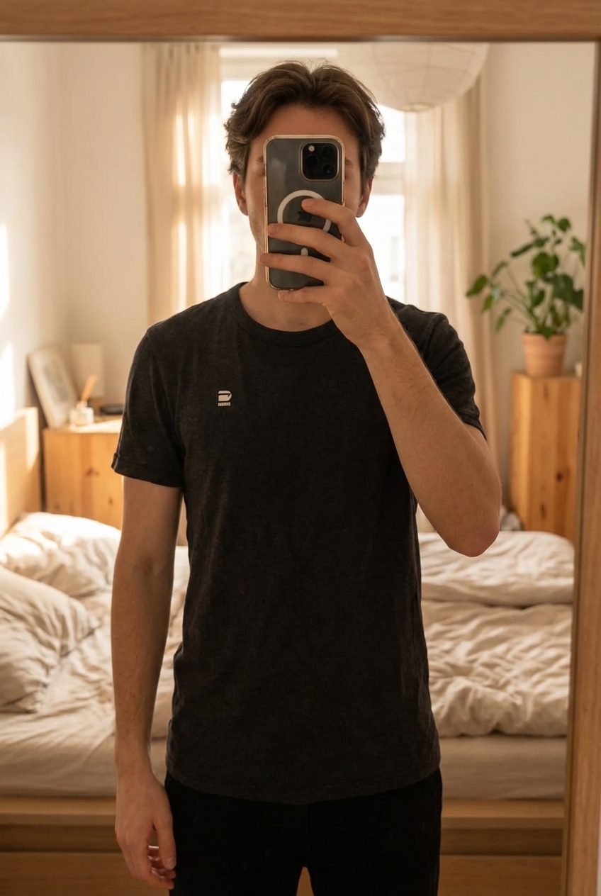 T shirt RAW debout, face à la caméra, dans une chambre à la lumière douce, avec une lumière naturelle filtrant par la fenêtre.