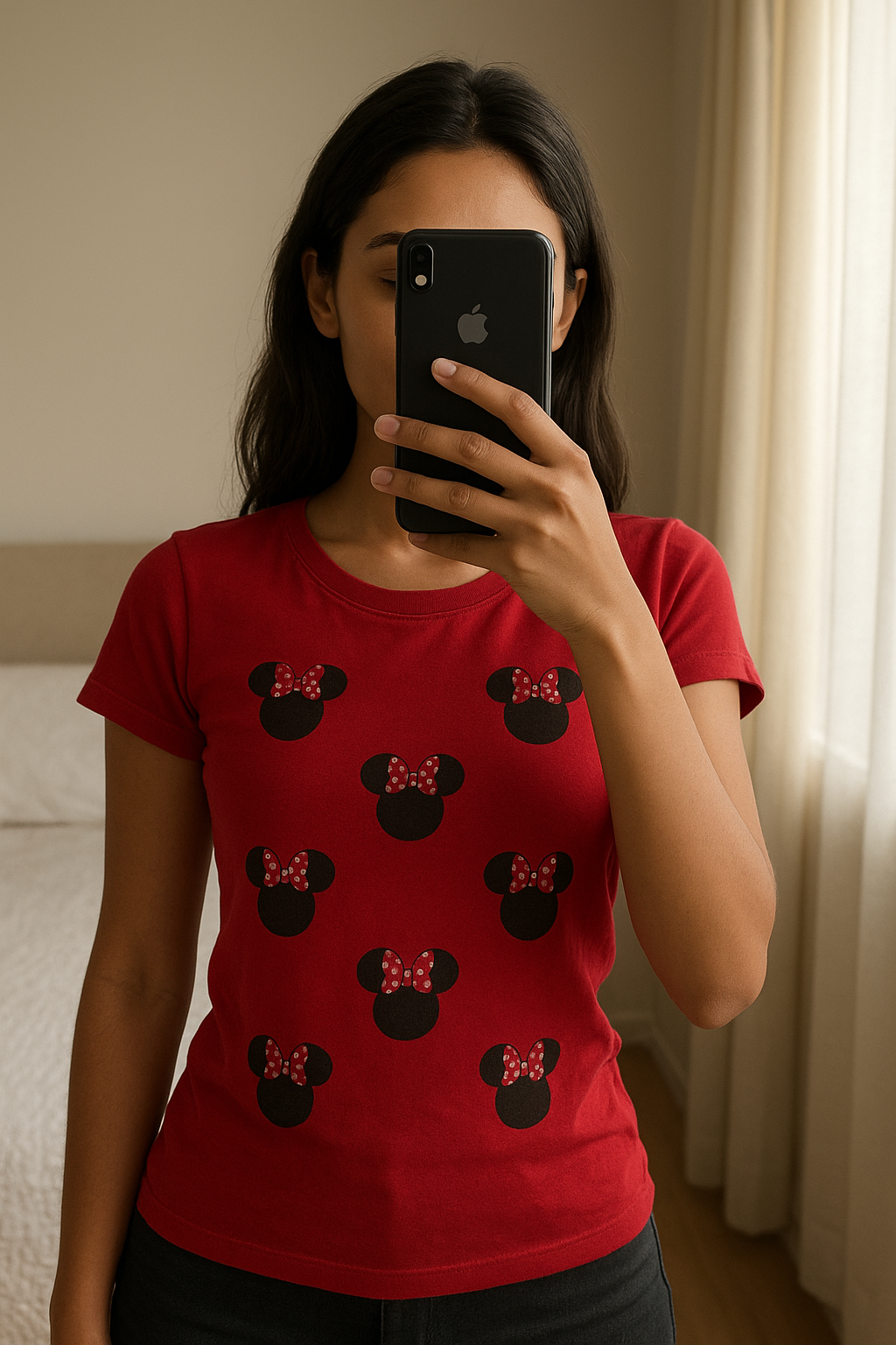 Une personne en T-shirt rouge S cambrant légèrement le dos pour une pose dynamique, dans une chambre à la lumière douce, avec une lumière naturelle filtrant par la fenêtre.