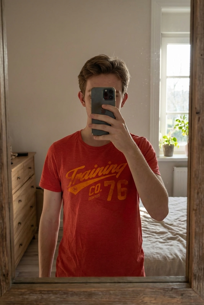 T shirt taille M debout, face à la caméra, dans une chambre à la lumière douce, avec une lumière naturelle filtrant par la fenêtre.