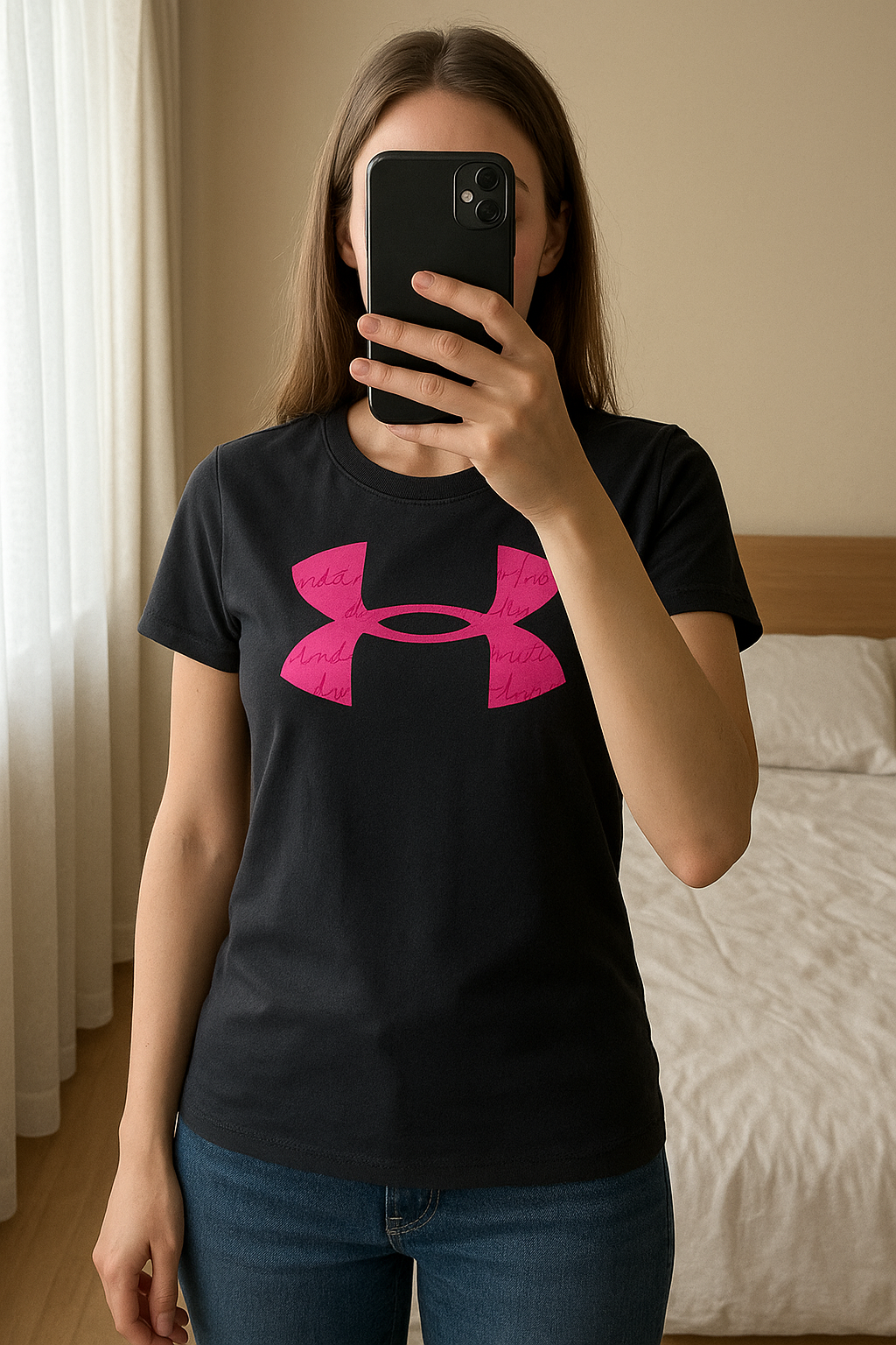 T-shirt Under Armour léger debout, face à la caméra, dans une chambre à la lumière douce, avec une lumière naturelle filtrant par la fenêtre.