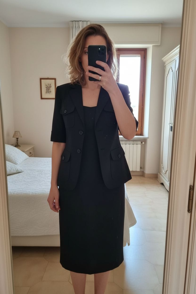 Tailleur tubino + giacca set Gattinoni 100% cotone nuovo con cartellino. tg. 46 italiana in piedi, rivolto verso la fotocamera, in una camera da letto con luce soffusa e luce naturale che filtra dalla finestra.