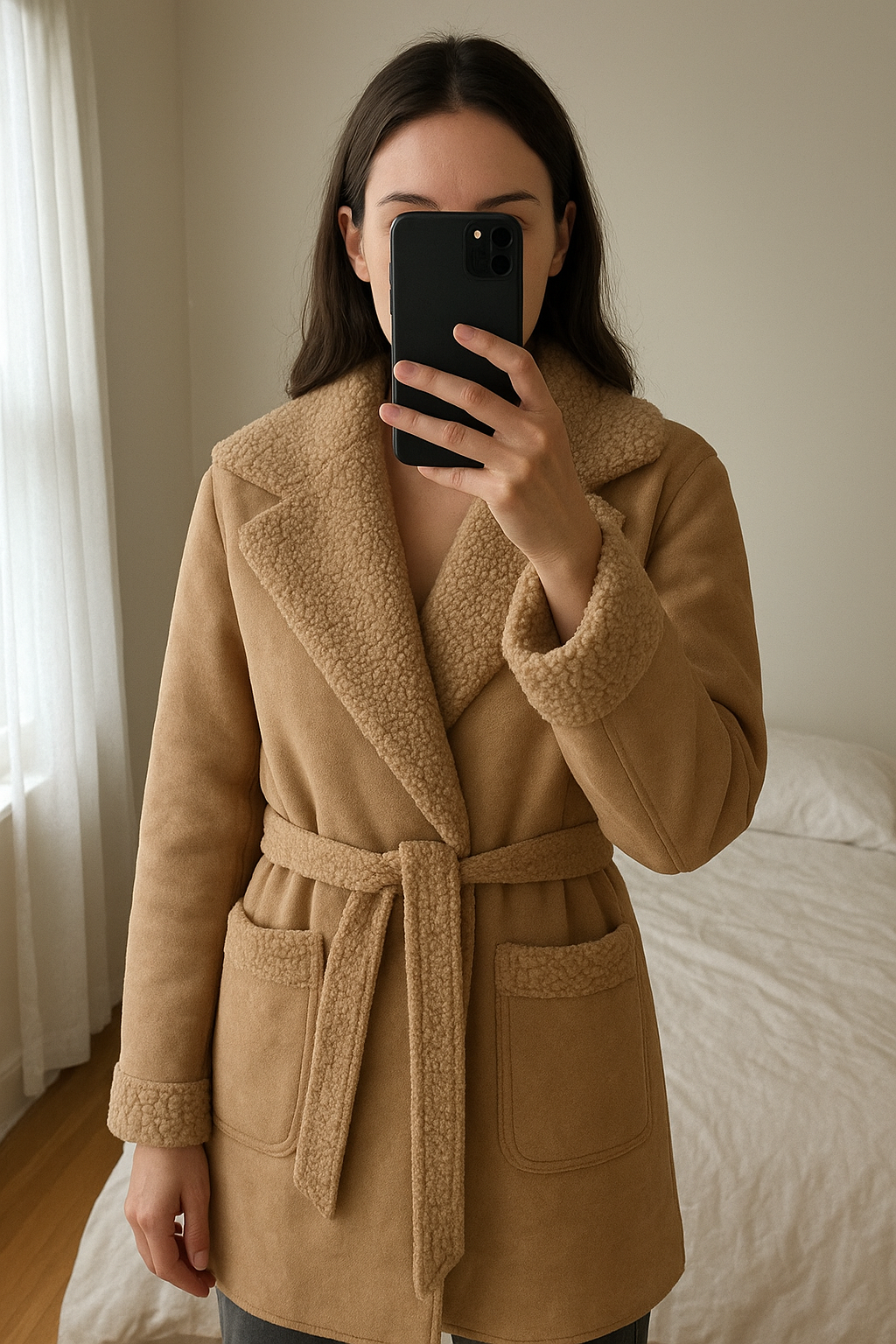 Teddymantel/ Mantel mit Teddyfell Gr.S/M 🐻 aufrecht stehend, der Kamera zugewandt, in einem sanft beleuchteten Schlafzimmer, mit natürlichem Licht, das durch ein Fenster fällt.