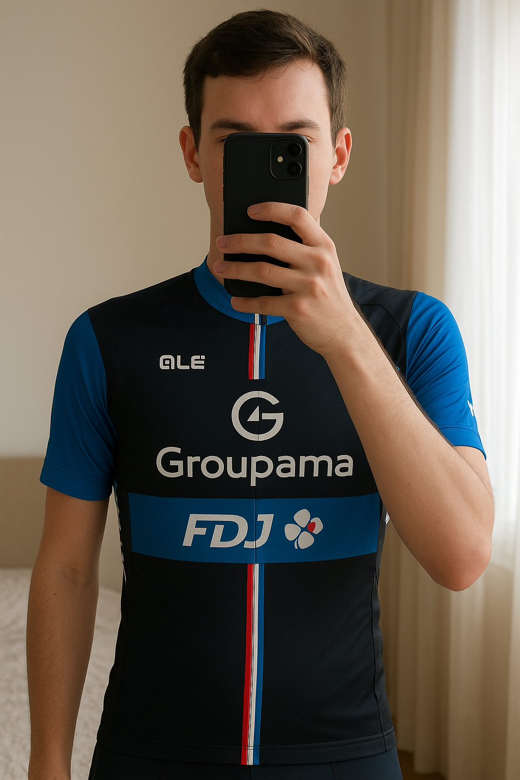 Tee shirt Cyclisme FDJ Groupama debout, face à la caméra, dans une chambre à la lumière douce, avec une lumière naturelle filtrant par la fenêtre.