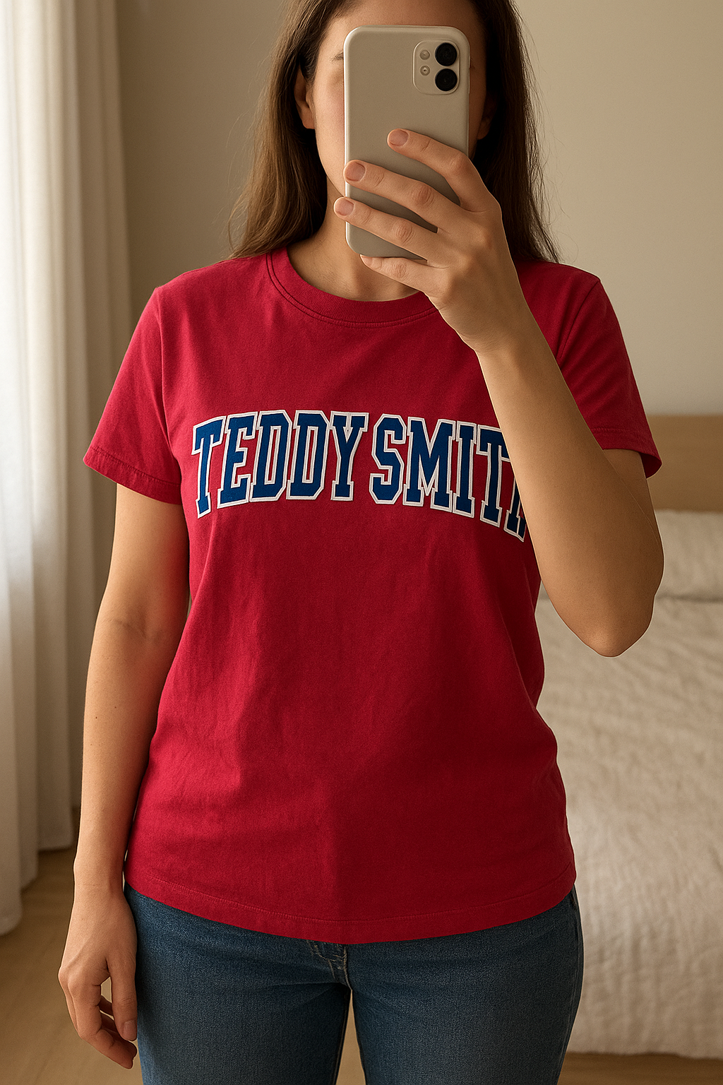 Tee shirt fille Teddy smith taille 12 ans debout, face à la caméra, dans une chambre à la lumière douce, avec une lumière naturelle filtrant par la fenêtre.