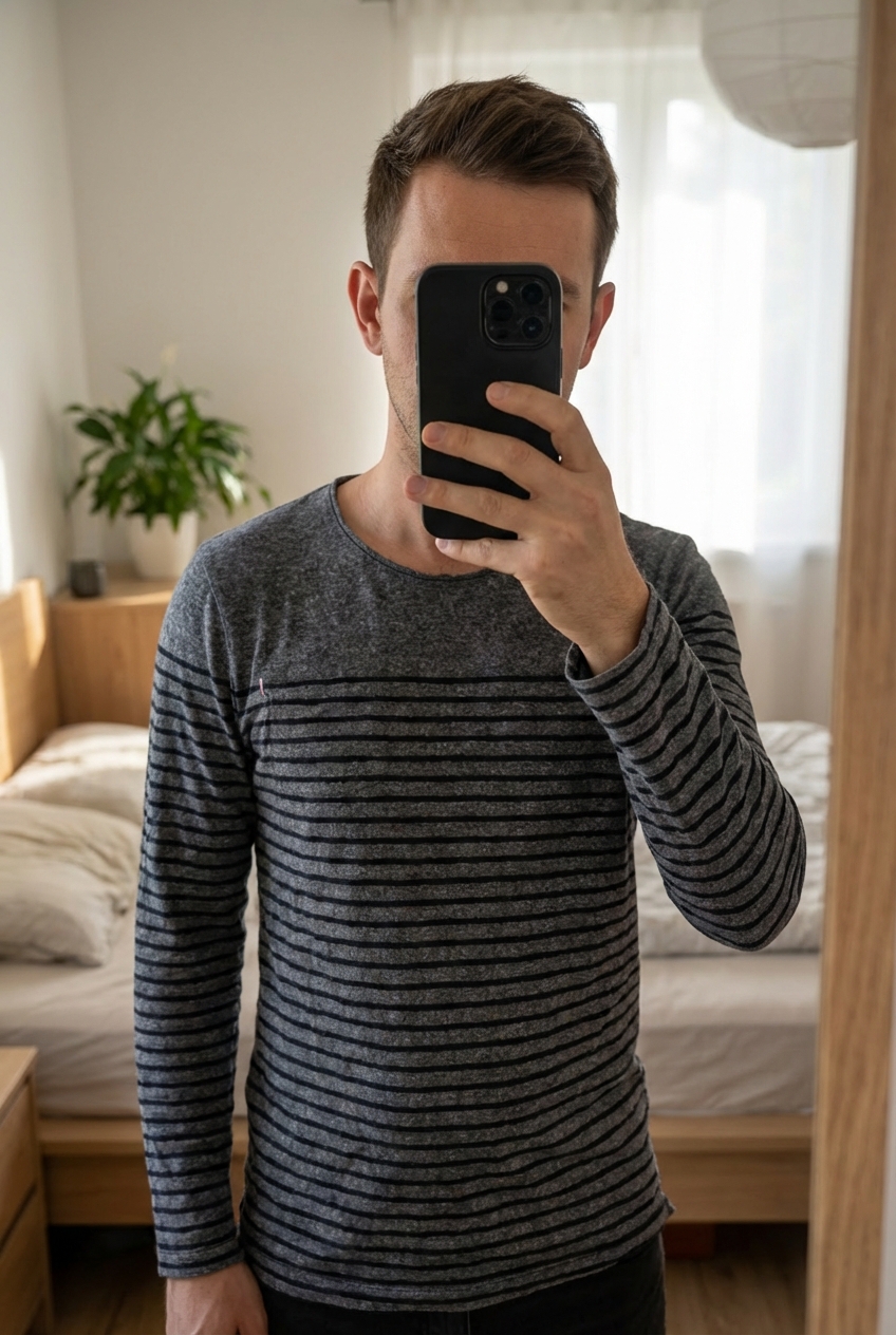 Tee shirt manche longue LTC debout, face à la caméra, dans une chambre à la lumière douce, avec une lumière naturelle filtrant par la fenêtre.