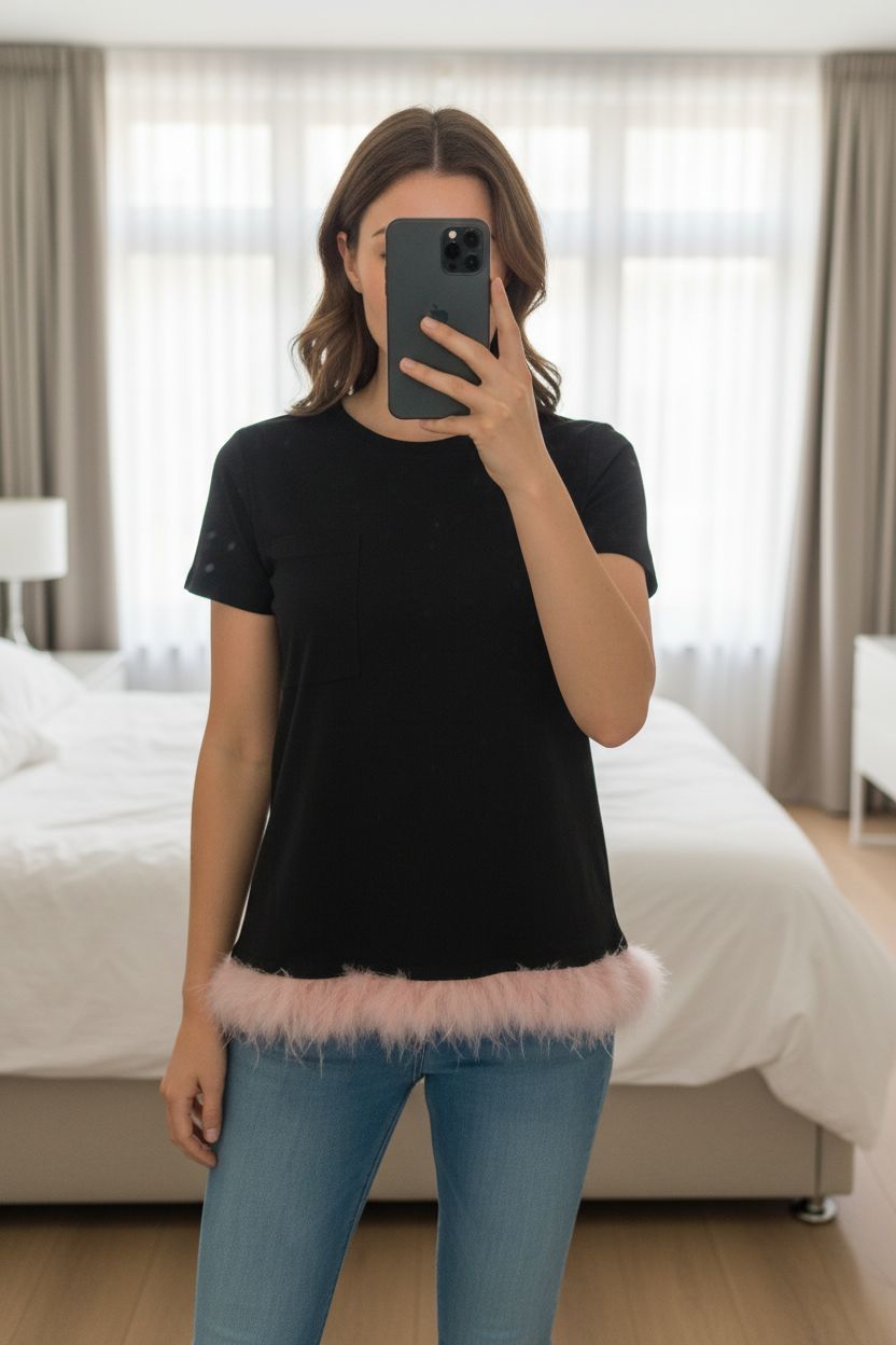 Tee-shirt plume rose zara taille M debout, face à la caméra, dans une chambre à la lumière douce, avec une lumière naturelle filtrant par la fenêtre.