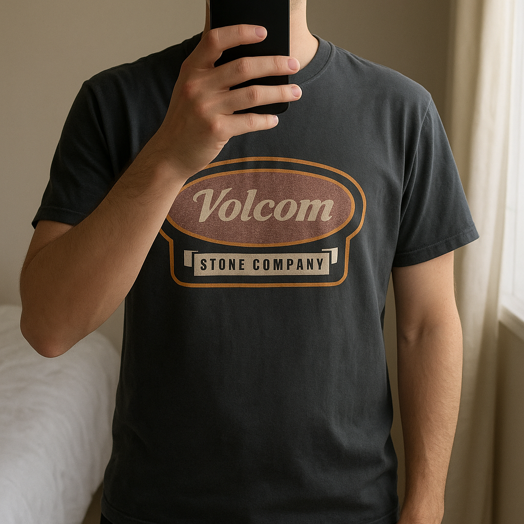 Tee-shirts Volcom debout, face à la caméra, dans une chambre à la lumière douce, avec une lumière naturelle filtrant par la fenêtre.