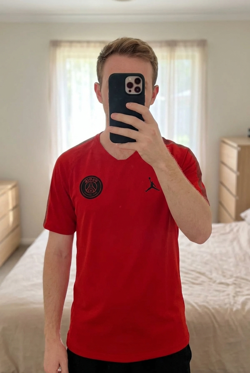 Una persona in Teeshirt de foot PSG in piedi, rivolto verso la fotocamera, in una camera da letto con luce soffusa e luce naturale che filtra dalla finestra.