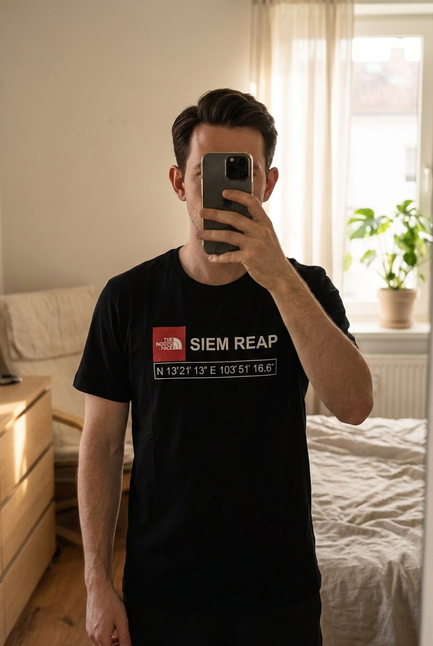 Teeshirt the north face homme S debout, face à la caméra, dans une chambre à la lumière douce, avec une lumière naturelle filtrant par la fenêtre.