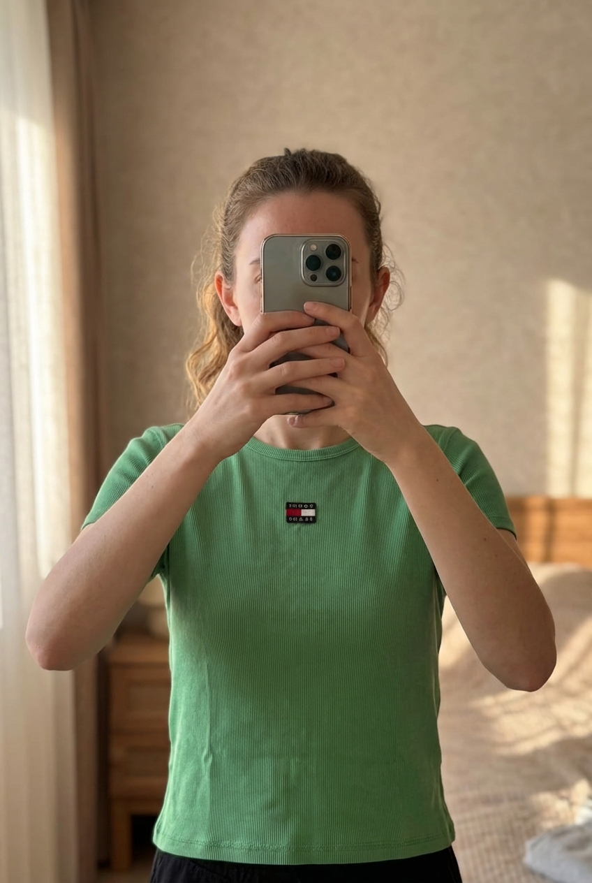 Una persona in Teeshirt tommy Hilfiger in piedi, rivolto verso la fotocamera, in una camera da letto con luce soffusa e luce naturale che filtra dalla finestra.