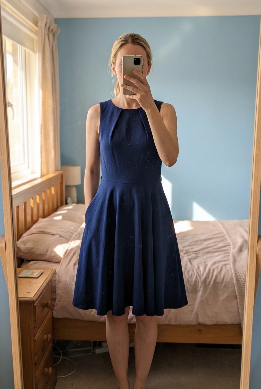 Tolles Etuikleid mit ausgestellten Rock und Taschen | Gr. 36 aufrecht stehend, der Kamera zugewandt, in einem sanft beleuchteten Schlafzimmer, mit natürlichem Licht, das durch ein Fenster fällt.