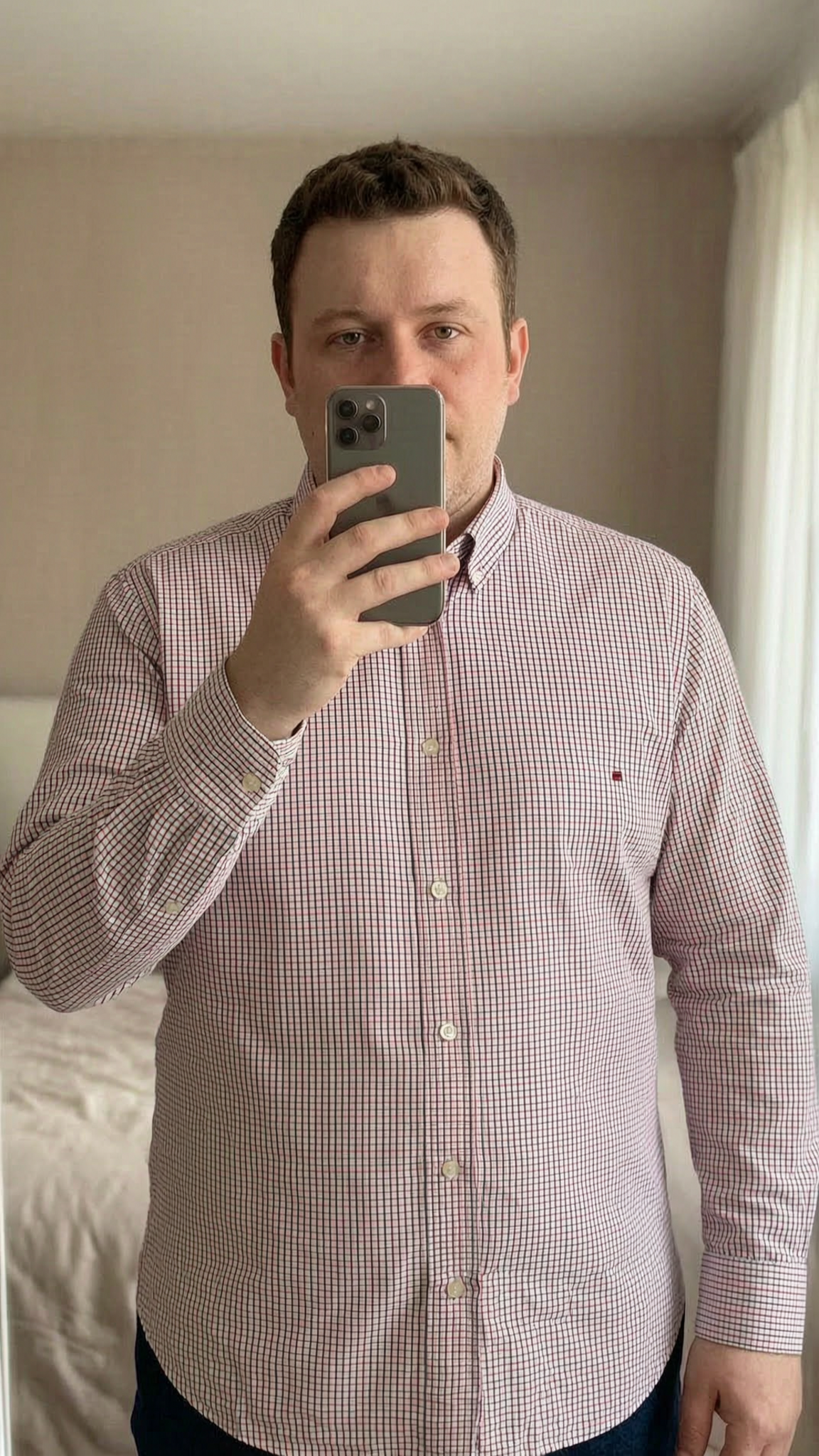 Une personne en Tommy Hilfiger taille XL, 80's Two Ply Cotton debout, face à la caméra, avec une silhouette légèrement plus ronde, dans une chambre à la lumière douce, avec une lumière naturelle filtrant par la fenêtre.