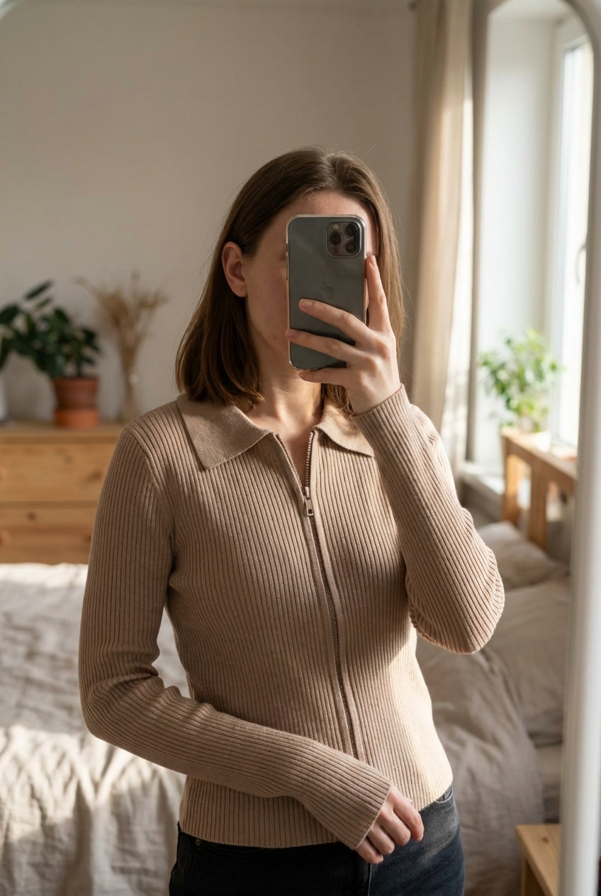 Top beige zip pimkie taille s debout, face à la caméra, dans une chambre à la lumière douce, avec une lumière naturelle filtrant par la fenêtre.