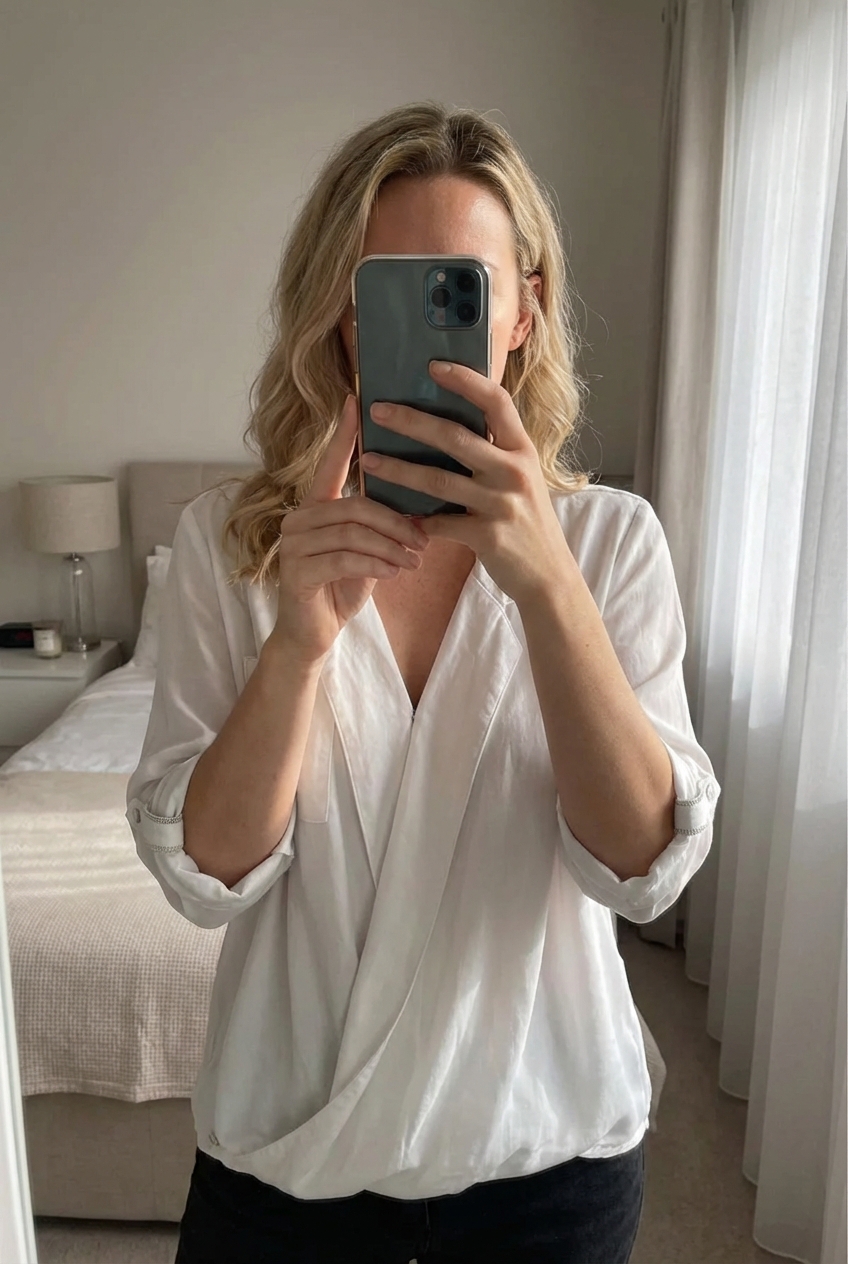 👚 Top blouse fluide Charlott’ Taille 42 XL – Blanc debout, face à la caméra, dans une chambre à la lumière douce, avec une lumière naturelle filtrant par la fenêtre.