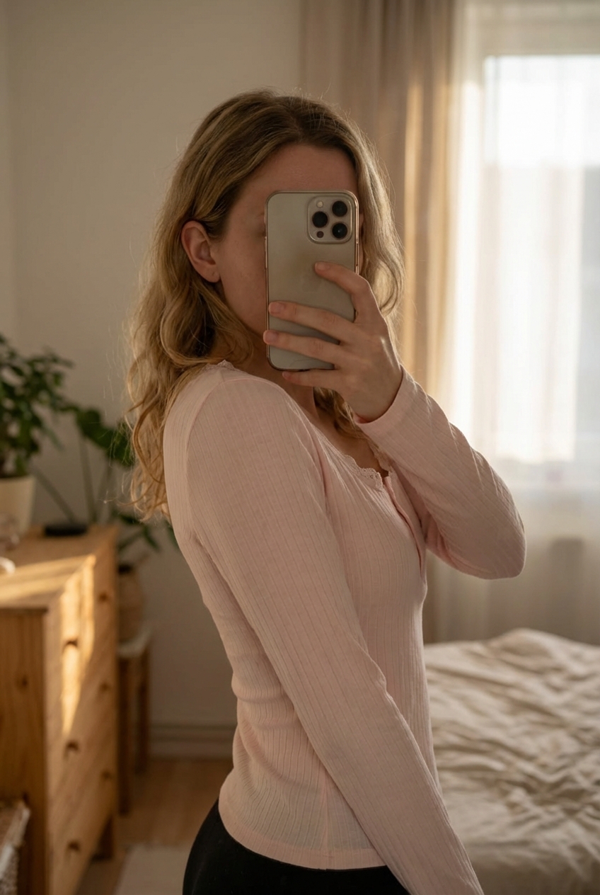 Une personne en Top blouse rose bonbon cambrant légèrement le dos pour une pose dynamique, avec une silhouette fine, dans une chambre à la lumière douce, avec une lumière naturelle filtrant par la fenêtre.