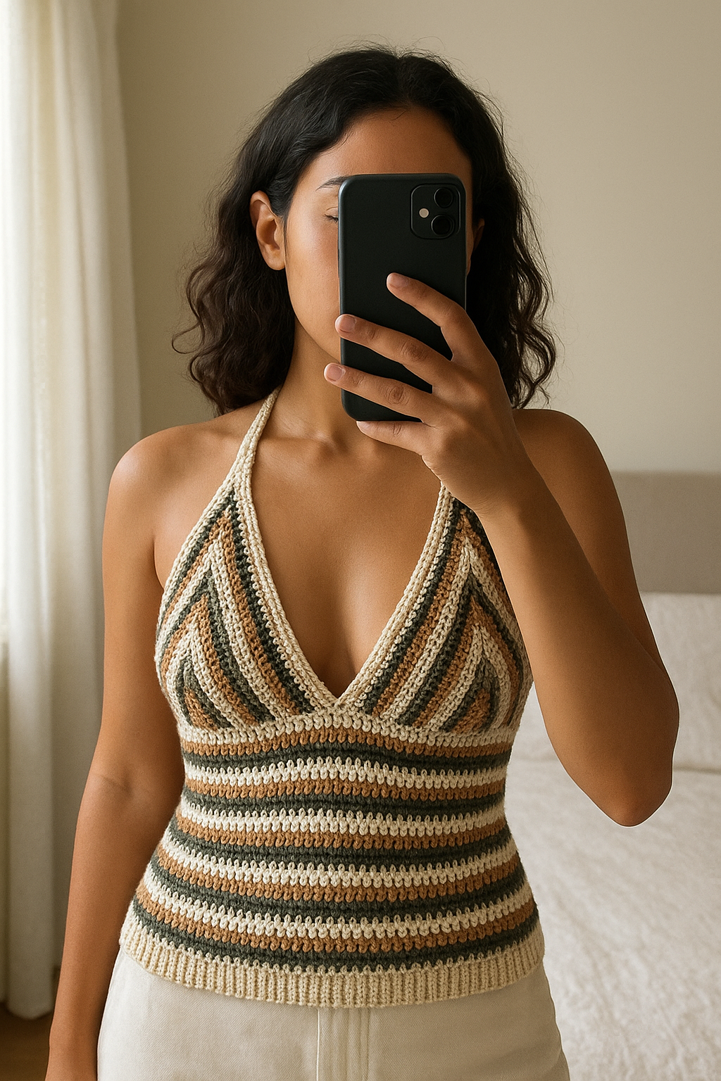 Une personne en Top, boutique indépendante, S cambrant légèrement le dos pour une pose dynamique, dans une chambre à la lumière douce, avec une lumière naturelle filtrant par la fenêtre.