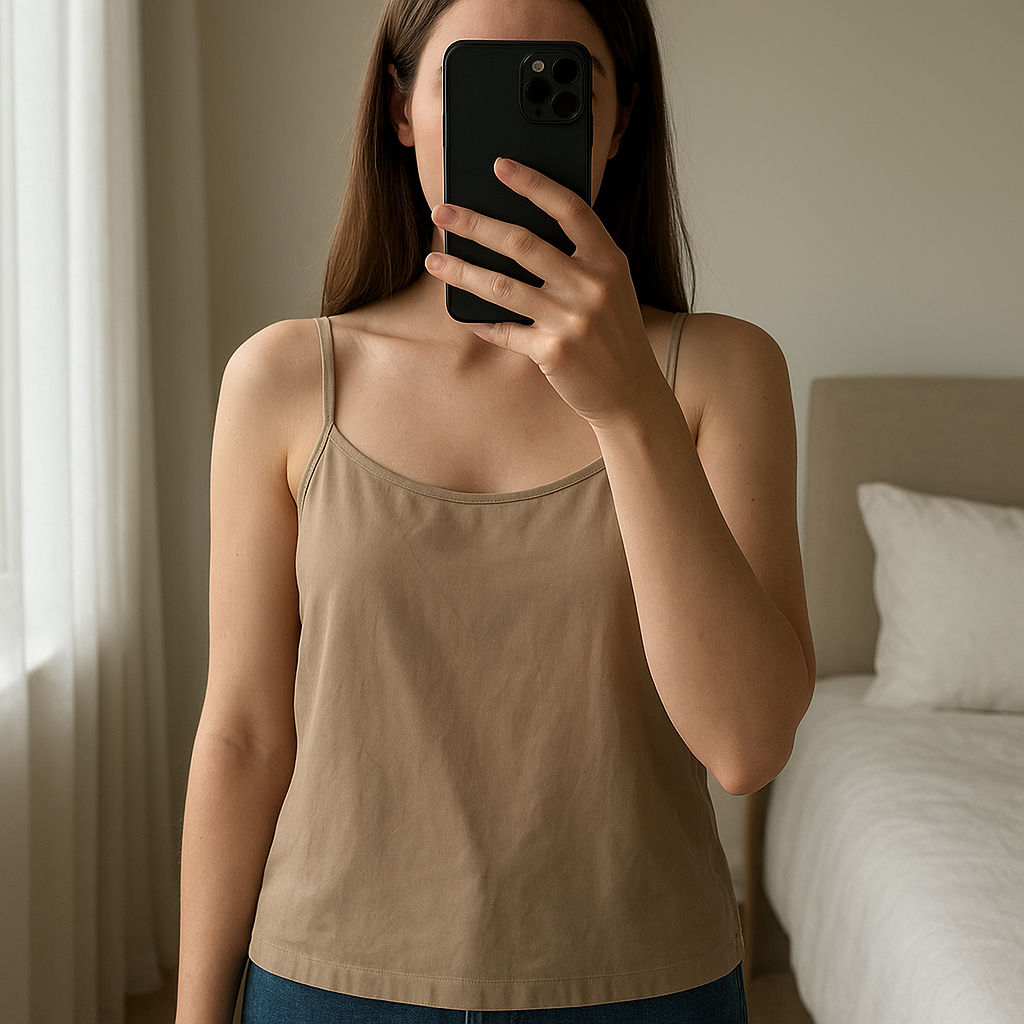 Top à bretelles Zara beige M - canottiere Maglietta Donna Zara in piedi, rivolto verso la fotocamera, in una camera da letto con luce soffusa e luce naturale che filtra dalla finestra.