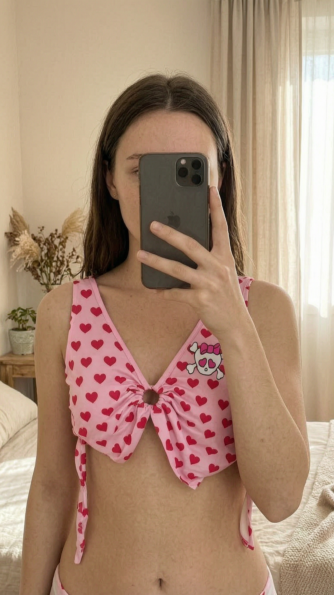 Top coeur debout, face à la caméra, dans une chambre à la lumière douce, avec une lumière naturelle filtrant par la fenêtre.