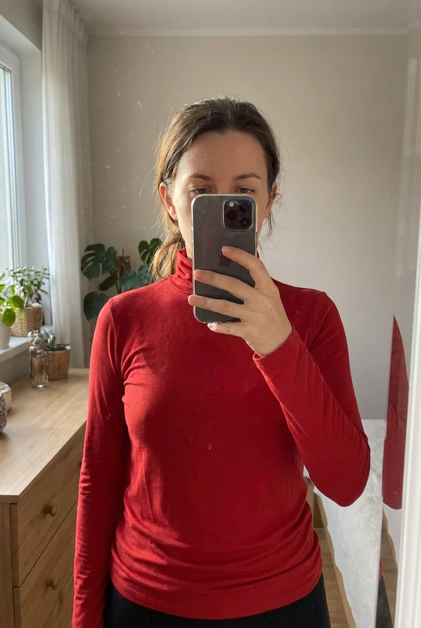Top col roulé Weekend MaxMara debout, face à la caméra, dans une chambre à la lumière douce, avec une lumière naturelle filtrant par la fenêtre.