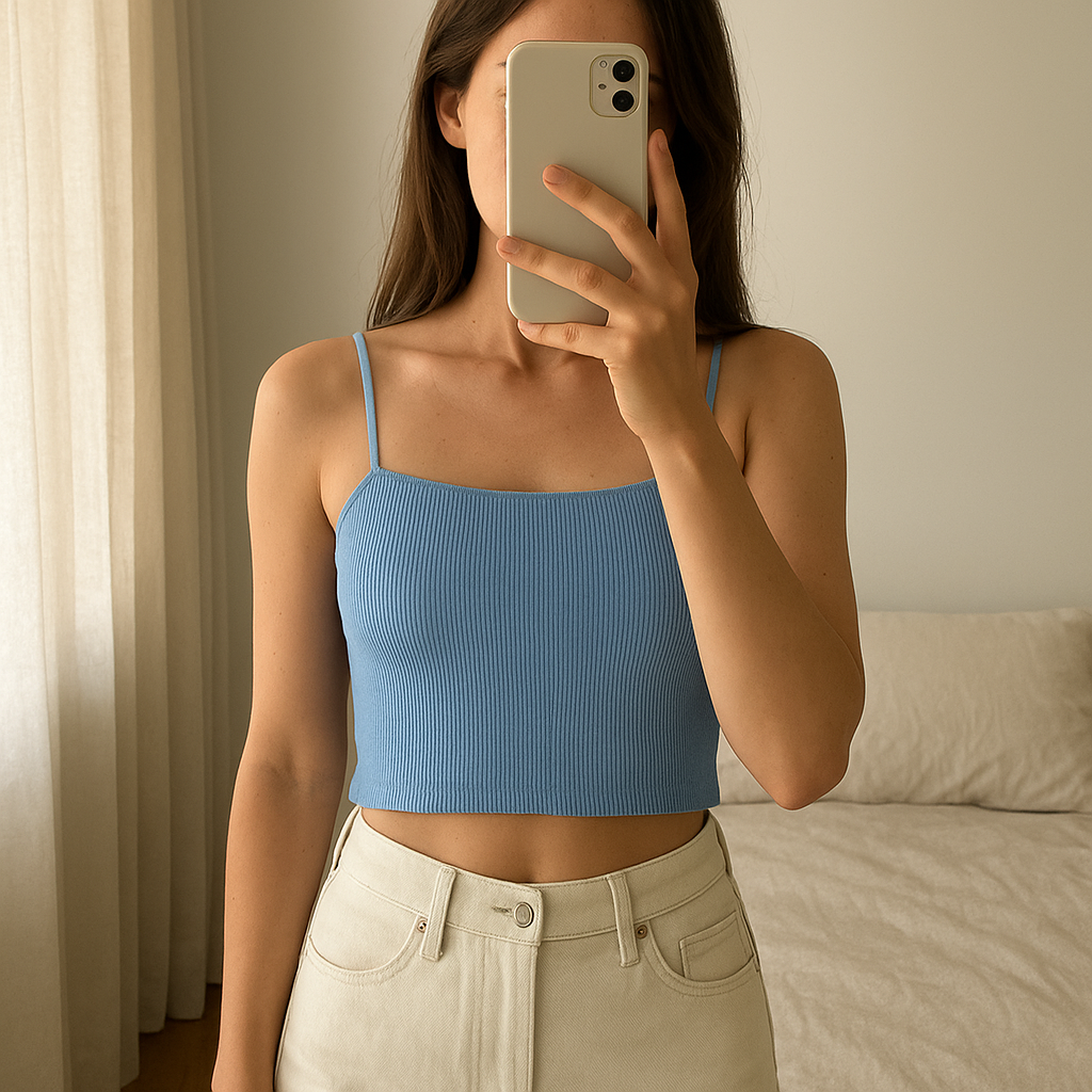 Top court debout, face à la caméra, dans une chambre à la lumière douce, avec une lumière naturelle filtrant par la fenêtre.