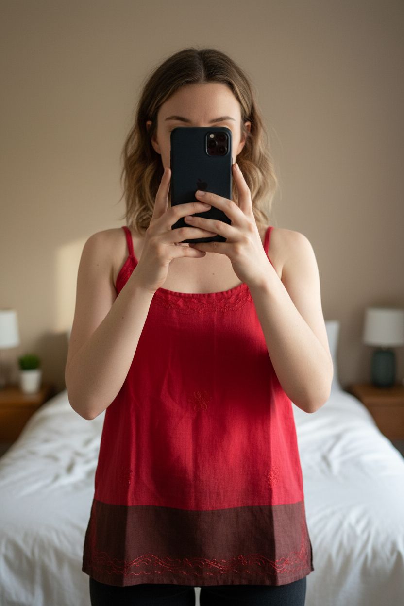 Top femme L - top canotte donna L in piedi, rivolto verso la fotocamera, in una camera da letto con luce soffusa e luce naturale che filtra dalla finestra.