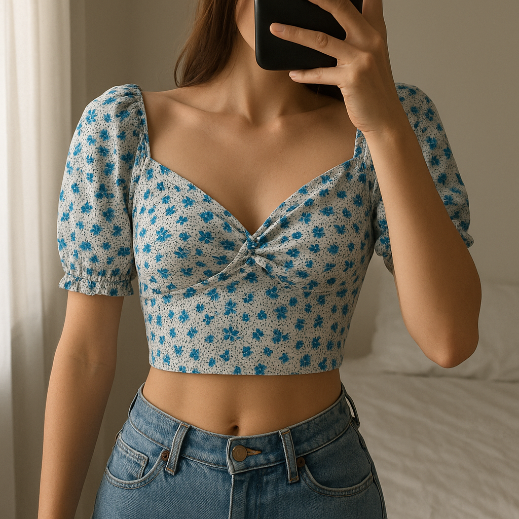 Una persona con Top flores Stradivarius arqueando ligeramente la espalda para una pose dinámica, con tipo de cuerpo delgado, en un dormitorio con luz suave y natural filtrándose por la ventana.