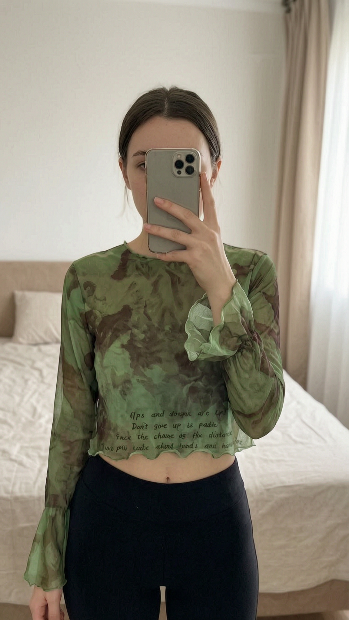 Top manche longue femme transparent L debout, face à la caméra, dans une chambre à la lumière douce, avec une lumière naturelle filtrant par la fenêtre.