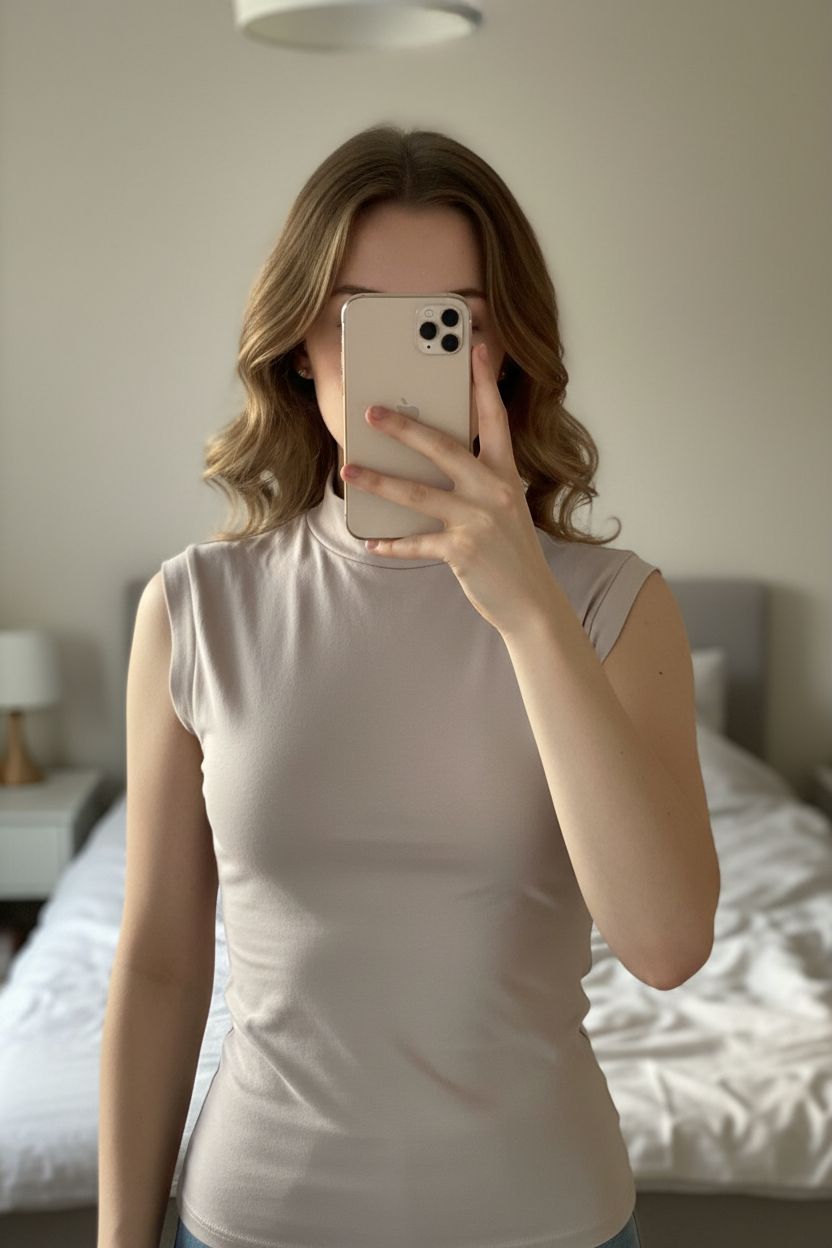 Top manches courtes moulant beige M - canotte beige in piedi, rivolto verso la fotocamera, in una camera da letto con luce soffusa e luce naturale che filtra dalla finestra.