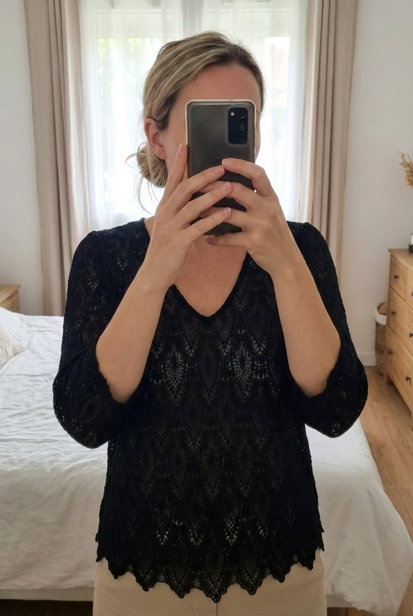 Top pull fin ajouré style vintage rétro Grace et Mila L neuf debout, face à la caméra, dans une chambre à la lumière douce, avec une lumière naturelle filtrant par la fenêtre.