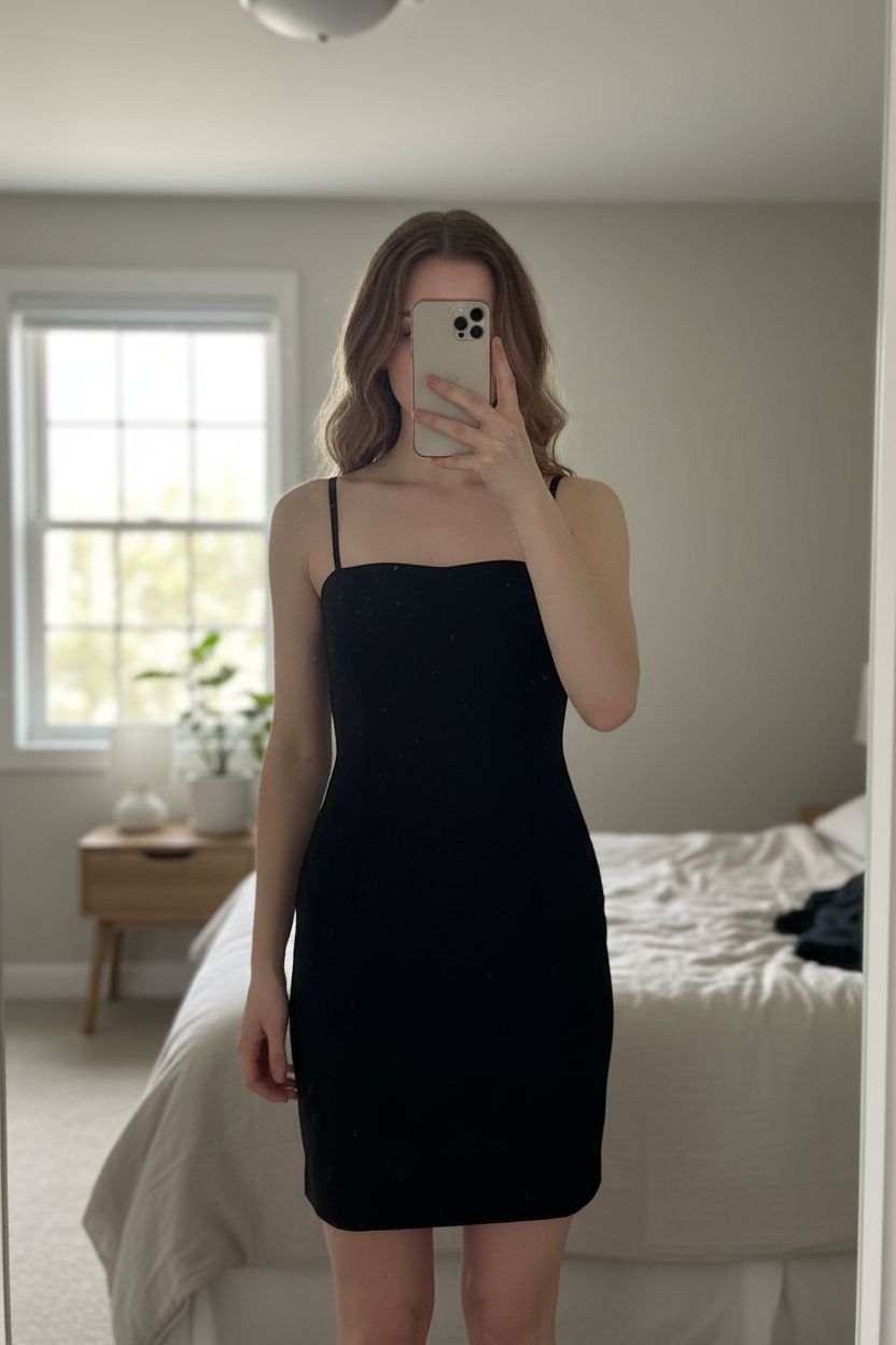 Tubino nero Subdued in piedi, rivolto verso la fotocamera, in una camera da letto con luce soffusa e luce naturale che filtra dalla finestra.