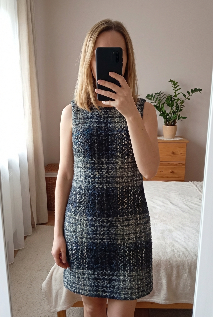 Tubino Sisley vintage midi smanicato con lana e alpaca nero/grigio/blu in piedi, rivolto verso la fotocamera, in una camera da letto con luce soffusa e luce naturale che filtra dalla finestra.