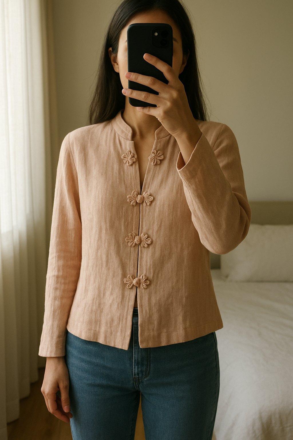 Tunique avec boutons en lin debout, face à la caméra, dans une chambre à la lumière douce, avec une lumière naturelle filtrant par la fenêtre.