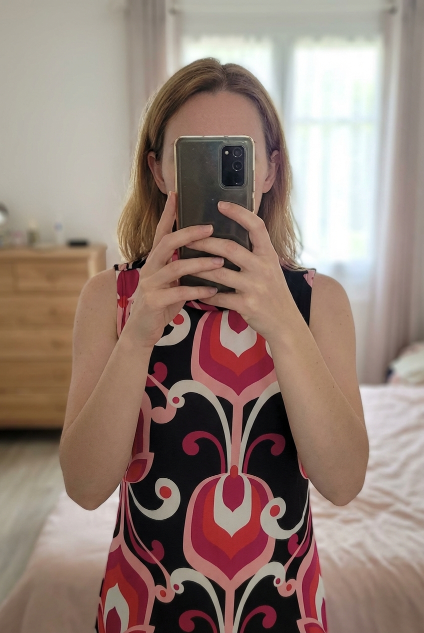 Tunique femme debout, face à la caméra, dans une chambre à la lumière douce, avec une lumière naturelle filtrant par la fenêtre.